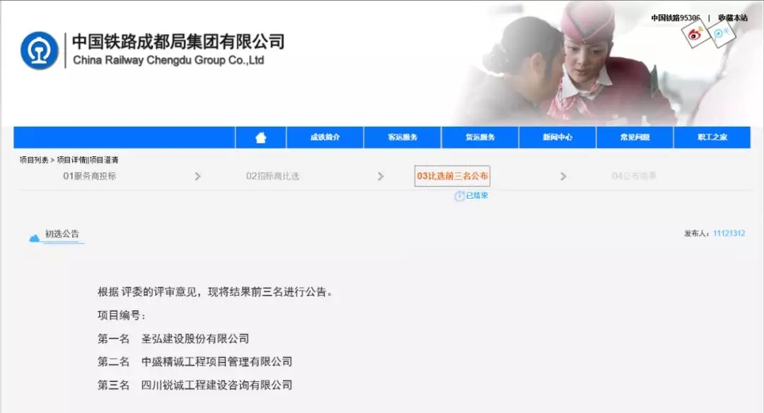 2019年11月4日,“锦城绿道项目涉铁部分工程造价咨询比选”(项目名称)进行公开招标,经评标委员会综合评审,确定圣弘建设股份有限公司为本项目工程造价咨询服务中标单位。