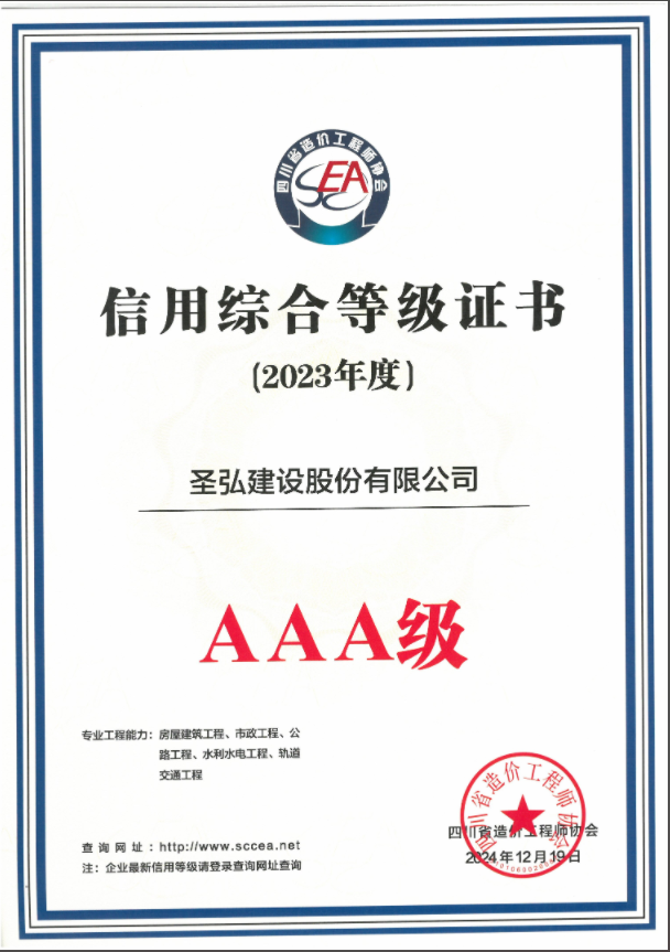 根据《四川省造价工程师协会关于召开2024年四川省工程造价咨询企业信用综合评价小组工作会议的通知》(川建价师协(2024)30号),四川省造价工程师协会组织开展了2024年四川省工程造价咨询企业信用综合评价工作。经评价小组核查、协会复核,圣弘建股份有限公司获2023年度AAA级信用综合等级荣誉